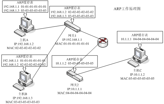 主机C通讯时,它直接把应该发送给网关1(192.168.1.1)的数据包发送到03-03-03-03-03-03这个
