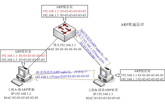 包的真实性就把自己ARP表中的192.168.1.2的MAC地址替换成03-03-03-03-03-03。当主机A想要与