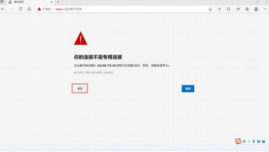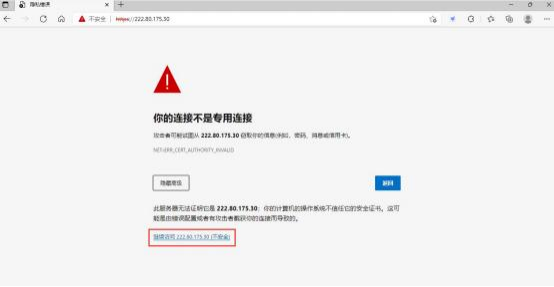 1、用户开通 VPN 服务后,需在浏览器(兼容所有常用浏览器)中登陆 https://222.80.175.30, 点击“高级”,再点击 “继续访问 222.80.175.30(不安全)”。